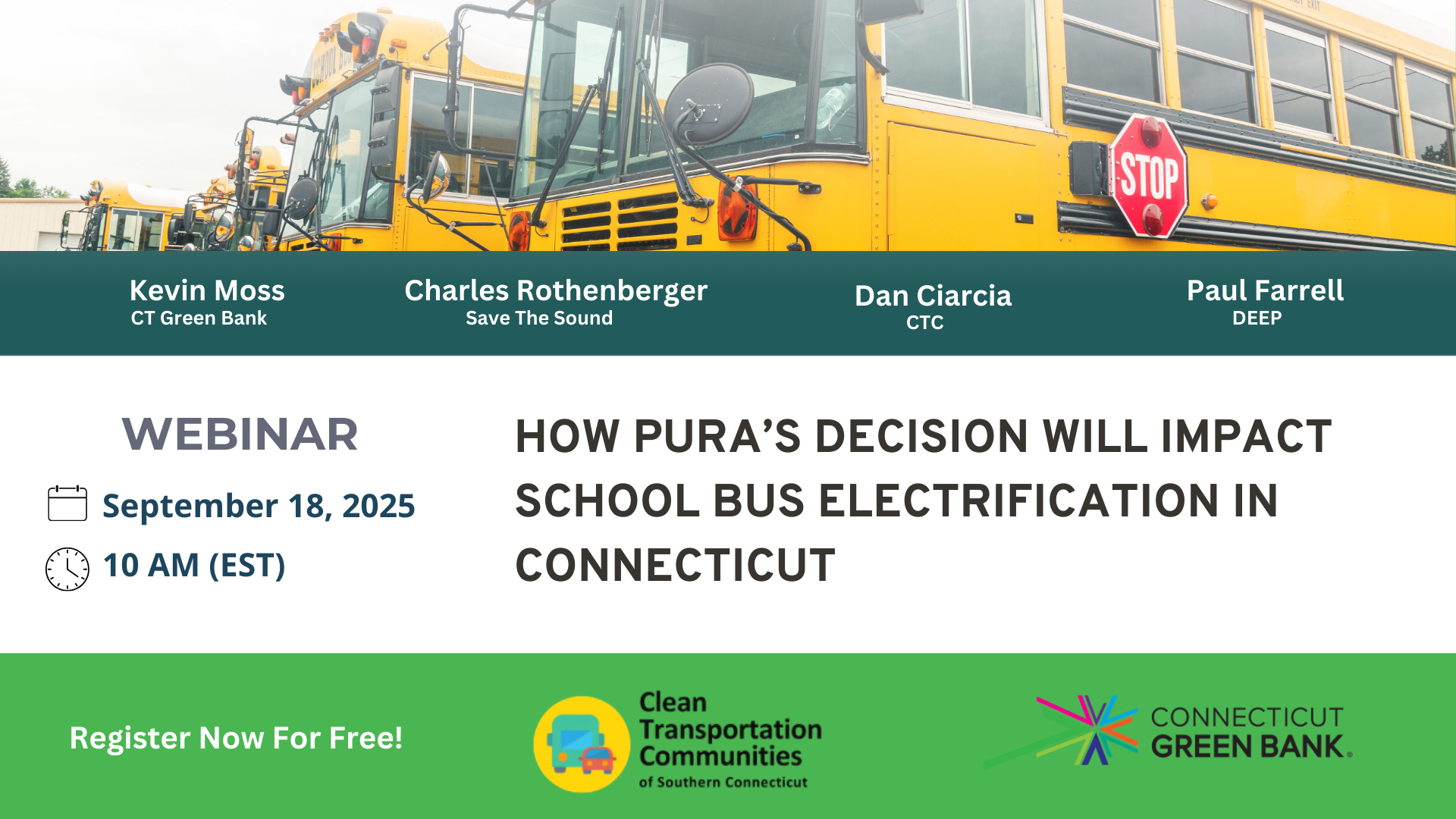The Public Utilities Regulatory Authority (PURA) recently established a new Medium- and Heavy-Duty Electric Vehicle (MHD EV) Five-Year Program, introducing new incentives and regulations to help accelerate vehicle electrification across Connecticut. This webinar, presented by Clean Transportation Communities of Southern Connecticut in partnership with the CT Green Bank, will focus on the implications of this decision for school districts as they plan their fleet conversions and the resources available to help them along the way